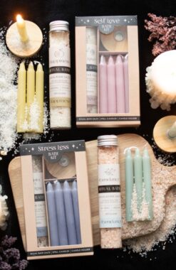 Набір складається із солі для ванни, чотирьох свічок та дерев’яної підставки для них